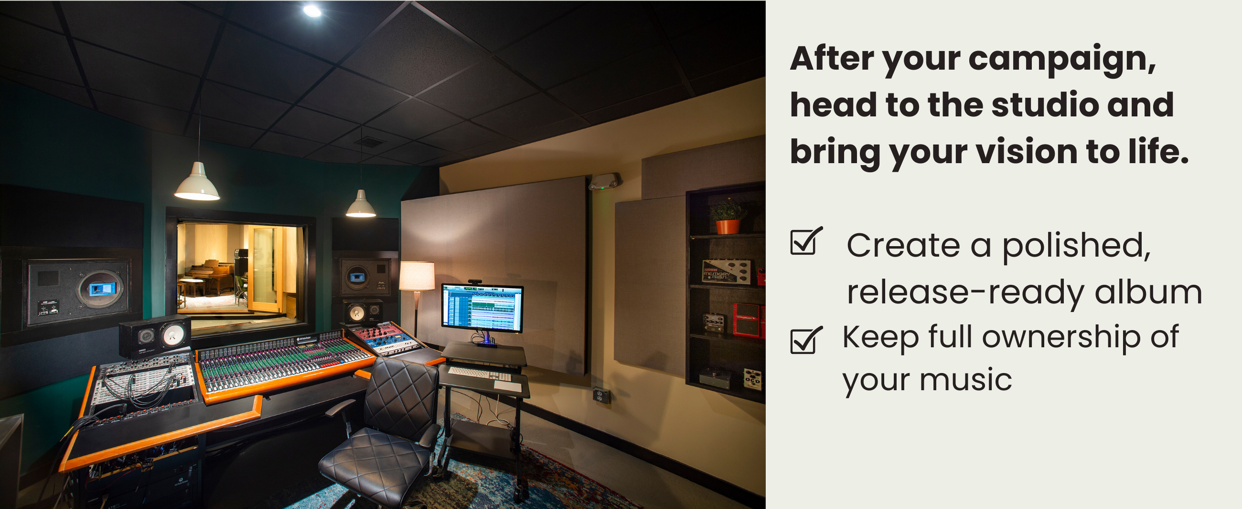 Selected artists work with our team of producers and musicians to fund and record a professional album with zero out-of-pocket costs. Request an invite to access our full application.
